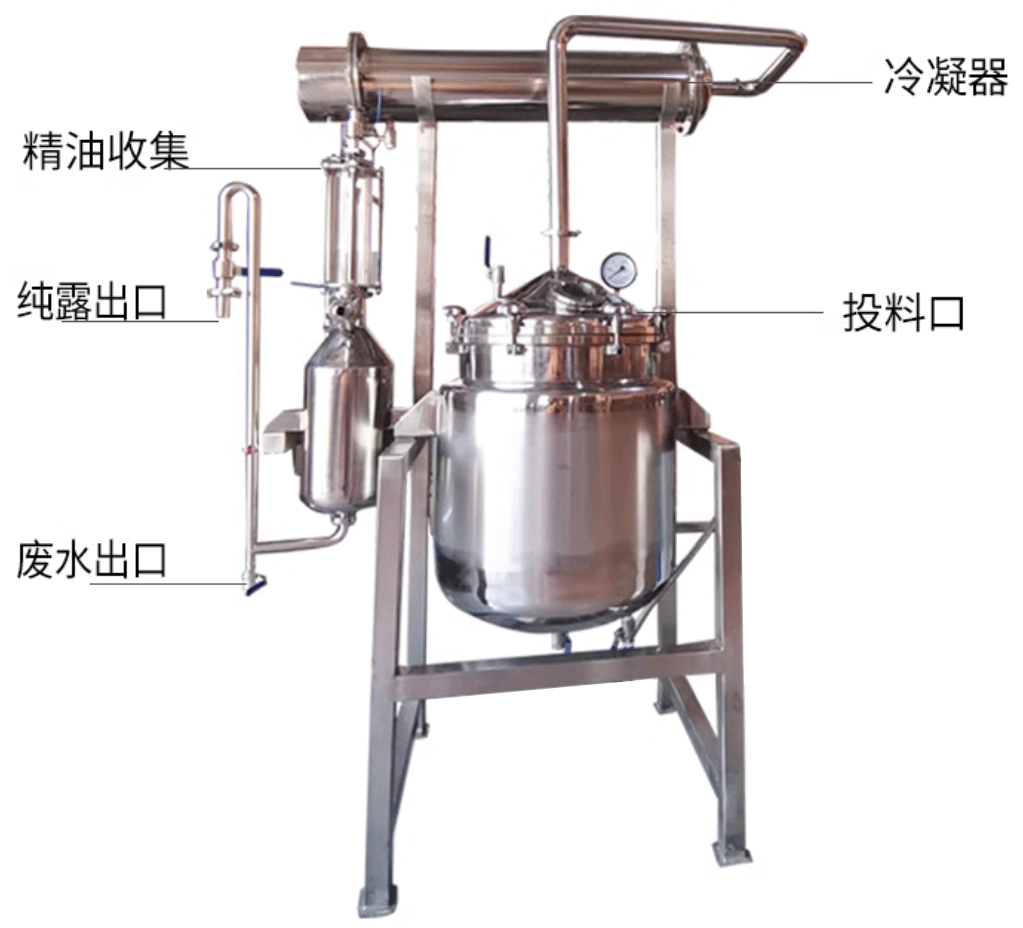 工藝流程:開啟加水,可隔水蒸餾,也可共水蒸餾,開電加熱或蒸汽,水沸騰產(chǎn)生蒸汽,蒸汽透過提取機(jī)內(nèi)物料,隨及將精油純露析出,精油純露蒸汽沿排汽管上